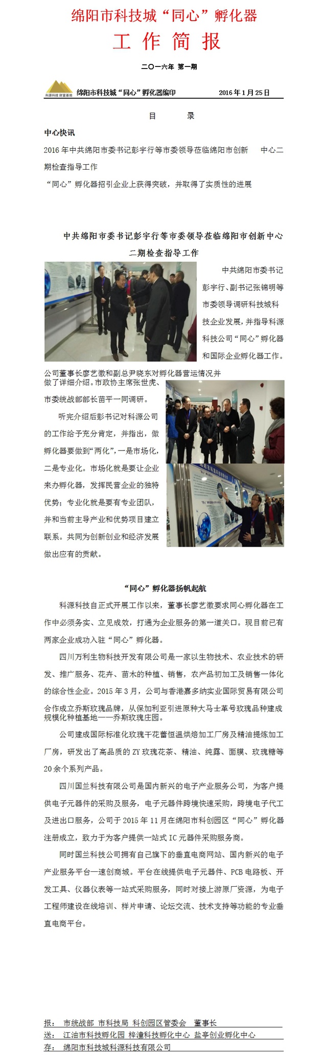 綿陽(yáng)市科技城“同心”孵化器二零一六年一月工作簡(jiǎn)報(bào)
