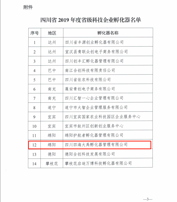12月31日,四川省科技廳公布了2019年度省級(jí)科技孵化器認(rèn)定備案名單,全省14家孵化器入選。我四川四海大禹孵化器管理有限公司運(yùn)營(yíng)的梓潼科技孵化中心成功通過備案,這是我科源科技下屬孵化器中第三個(gè)被成功認(rèn)定為省級(jí)科技企業(yè)孵化器,取得的又一次重大突破! 上一篇:科源集團(tuán)廖藝徽董事長(zhǎng)一行到鹽亭調(diào)研創(chuàng)業(yè)孵化中心在孵企業(yè) ????下一篇:喜訊?。?019年興文眾創(chuàng)空間成功備案省級(jí)眾創(chuàng)空間